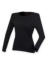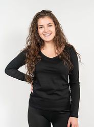 Jednoduché pružné dámské tričko s dlouhým rukávem. Materiál je Fair Trade, prodyšný a díky příměsi elastanu i pružný. Slim-fit střih je užší, dlouhý a měl by postavu mírně obepínat. Doporučujeme věnovat zvýšenou pozornost tabulce velikostí.