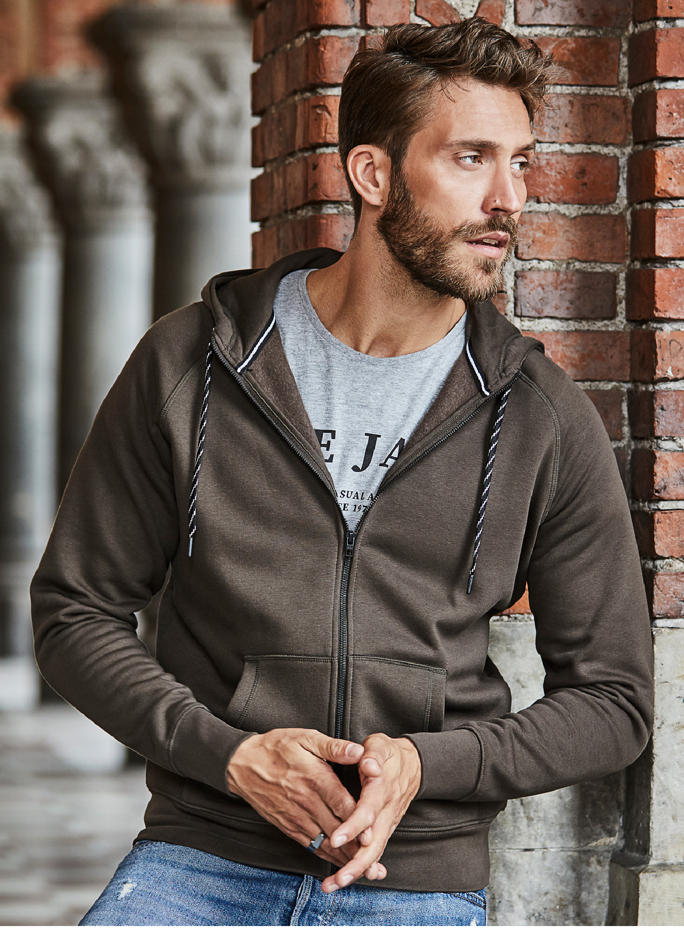 Kvalitní pánská mikina se zipem, kapucí a bočními kapsami. Je vyrobena převážně z kvalitní egyptské bavlny s ring-spun úpravou, díky čemuž se nesráží a nevybledne, ať už si mikinu vyberete v kterékoliv barvě. Z vnitřní strany je kartáčovaná, a tedy měkká, hřejivá a pohodlná, z vnější strany zase hladká a slušivá. Kapuce se dá stahovat stylovými šňůrkami a zmrzlé ruce mají vždycky dost místa ve dvou kapsách.